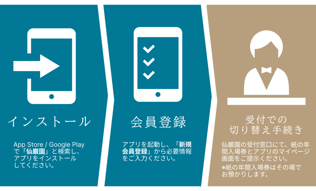 年間入場券 アプリ提供への移行について(2026年4月より) 2025/12/27 年間入場券がアプリに切り替わります(2026年4月〜) ご来場者の利便性向上と運用の効率化を目的に、2026年4月より、仙巌園の年間入場券はスマートフォンアプリでの提供に移行いたします。 アプリでできること スマートフォンでコードをかざすだけでご入場いただけます 有効期限・残日数をアプリ上でご確認いただけます 窓口に行かずに年間入場券を購入・更新いただけます(※クレジットカード払いに対応予定) 会員限定特典やお知らせをアプリ上でお受け取りいただけます その他の機能も、今後追加予定です! 現在、年間入場券をお持ちの方へ(更新をご検討中の方も含む) 紙の年間入場券は、有効期限内であればそのままご利用いただけます。2026年4月1日以降は、ご希望に応じてアプリへの切り替えも可能です。 アプリへの切り替え手順(2026年4月1日以降) アプリへの切り替えをご希望の方は、以下の手順でお手続きください。 アプリのインストールApp Store / Google Play(Playストア)で「仙巌園」と検索し、アプリをインストールしてください。 会員登録アプリを起動し、「新規会員登録」から必要情報をご入力ください。 受付での切り替え手続き仙巌園受付窓口にて紙の年間入場券とアプリのマイページ画面をご提示ください。※紙の年間入場券はその場でお預かりします。 ⚠️ 2026年4月1日時点で有効な紙の年間入場券をお持ちの場合、アプリ上で新たに購入すると、二重支払いになります。移行の際は、必ず窓口での切り替え手続きをご利用ください。 次回更新をご検討中の方へ 2026年4月以降の更新は、アプリが基本となります。操作にご不安のある方は、窓口での個別対応を予定しております。※アプリの詳細な操作方法・インストール方法は、後日、公式HPにて案内予定です。 よくあるご質問 アプリに切り替えたら紙の年間入場券は使えなくなりますか?→はい。アプリへの切り替え後は、紙のパスは無効になります。パスワードを忘れてしまった場合はどうなりますか?→ご登録のメールアドレスが分かれば、ご自身で再設定が可能です。ご登録のメールアドレスをお忘れの場合は、ご本人確認のうえ、受付窓口にて対応いたします。仙巌園にお越しいただき、受付窓口のスタッフまでお声がけください。 お問い合わせ ご不明な点がございましたら、以下よりお問い合わせください。 仙巌園お問い合わせフォーム 今後も、皆さまに快適にご利用いただけるよう、サービス改善に努めてまいります。