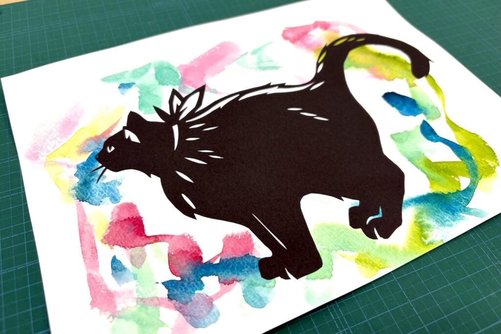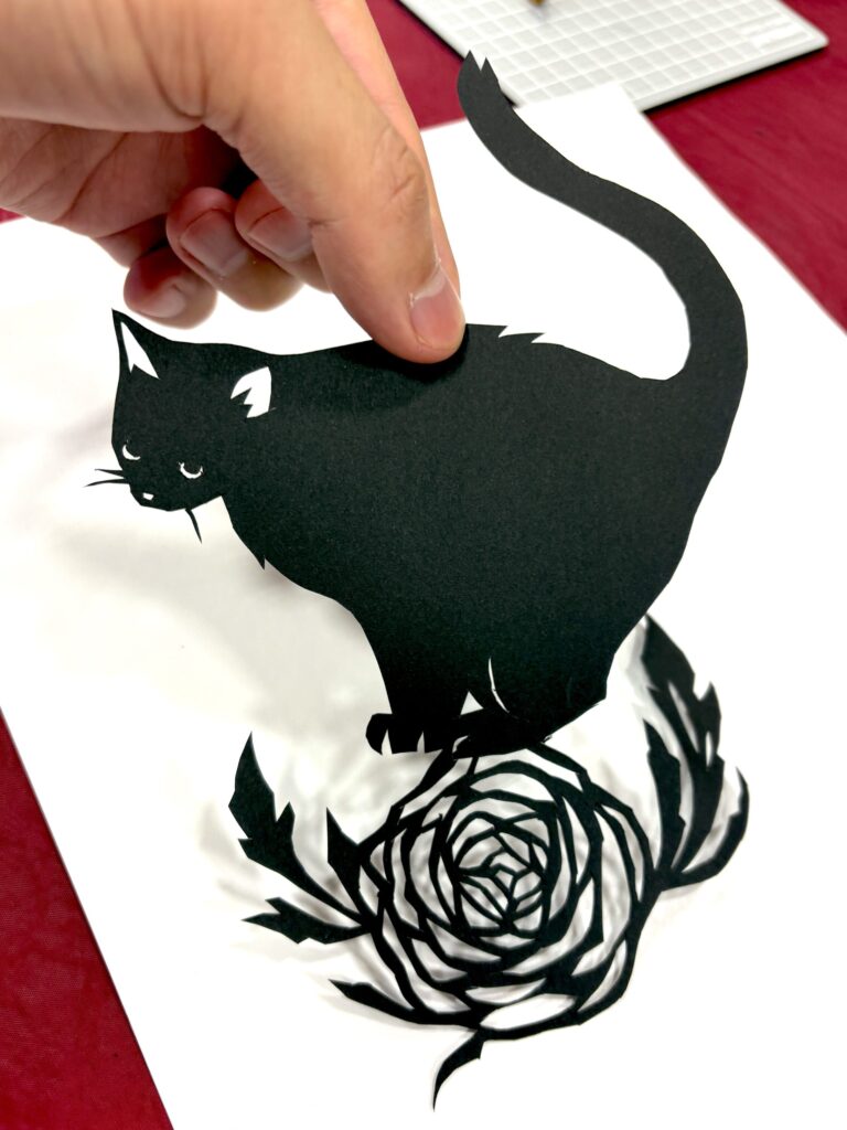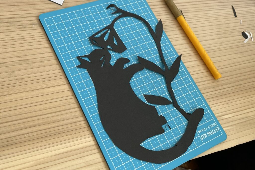 お好きな図案を選んで下絵をなぞり、切り進めていくと、世界にひとつだけの猫の切り絵が出来上がります。